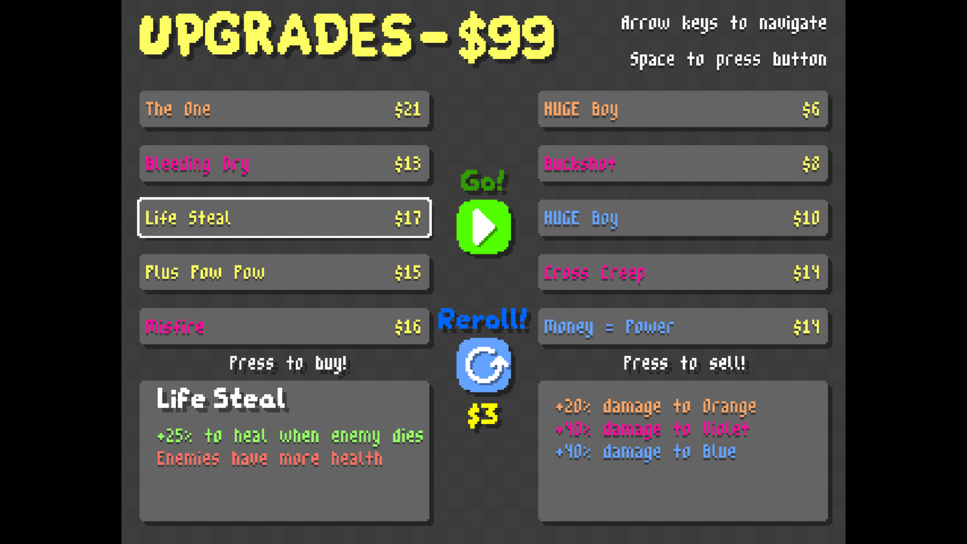 A rainbow-roguelike inspired by games like Binding of Isaac and SNKRX, You play as GRN who is fighting through every color of the rainbow to be THE LAST COLOR STANDING! Make pit stops at the upgrade and gun shops to become stronger to take over the rainbow. Once you defeat every color of the rainbow, enter the DOUBLE RAINBOW!!!